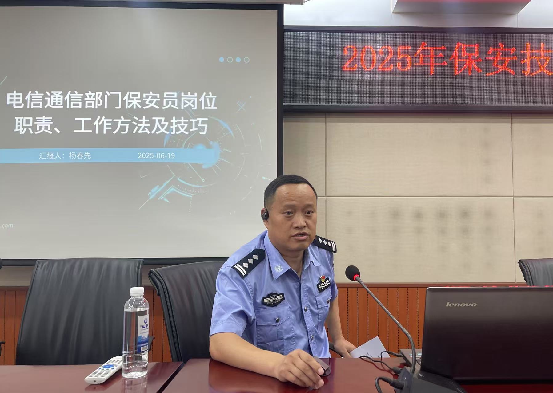 隨后,懷化市公安局鶴城分局治安大隊(duì)副大隊(duì)長楊春先為保安人員帶來了一場精彩的專題講座。講座圍繞 “通信部門保安員崗位職責(zé)、工作方法及技巧” 展開,楊副大隊(duì)長憑借豐富的實(shí)戰(zhàn)經(jīng)驗(yàn)和專業(yè)知識,深入淺出地講解了通信部門安保工作的特點(diǎn)與重點(diǎn)。他從保安員的基本職責(zé)出發(fā),詳細(xì)闡述了日常巡邏、門禁管理、突發(fā)事件應(yīng)對等工作的規(guī)范流程和實(shí)用技巧,并結(jié)合實(shí)際案例,生動地剖析了在工作中可能遇到的各種問題及解決方法。參訓(xùn)人員認(rèn)真聆聽,仔細(xì)記錄,紛紛表示受益匪淺。